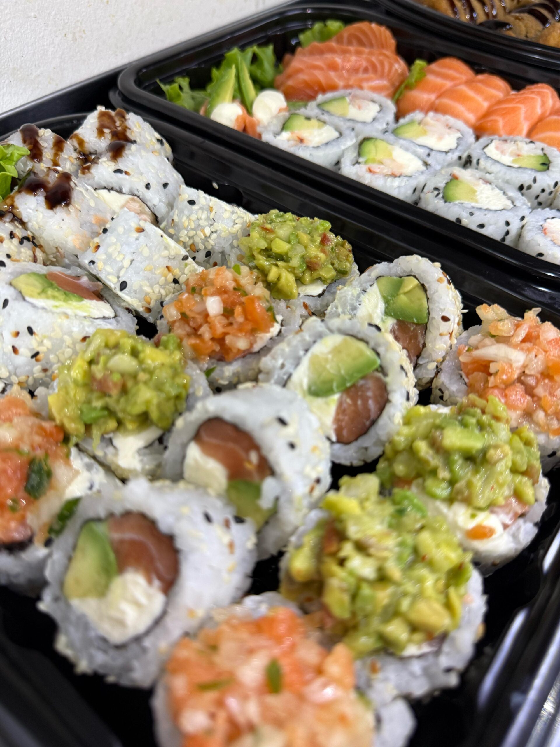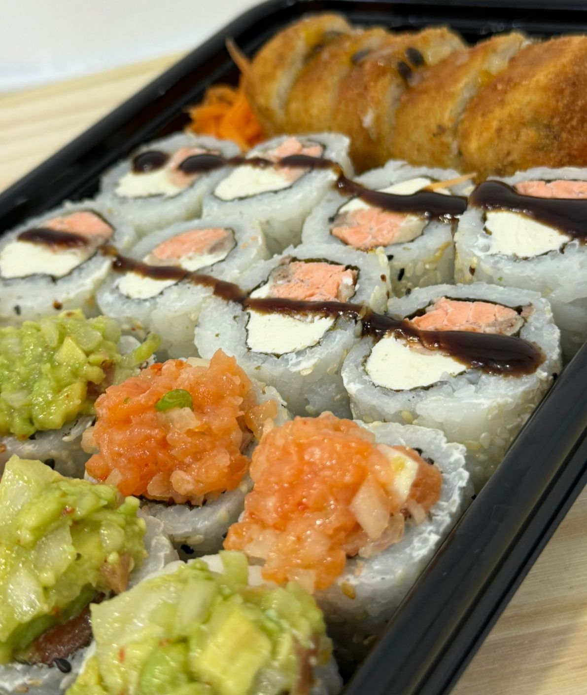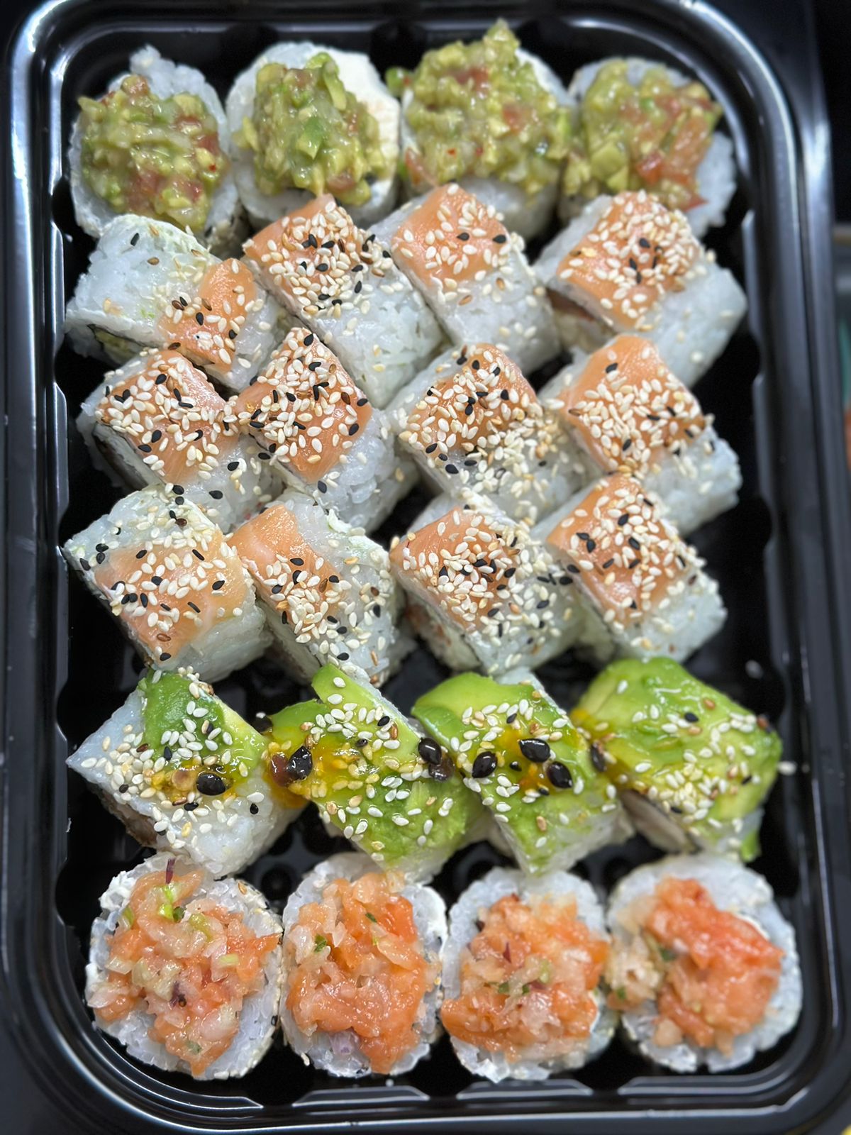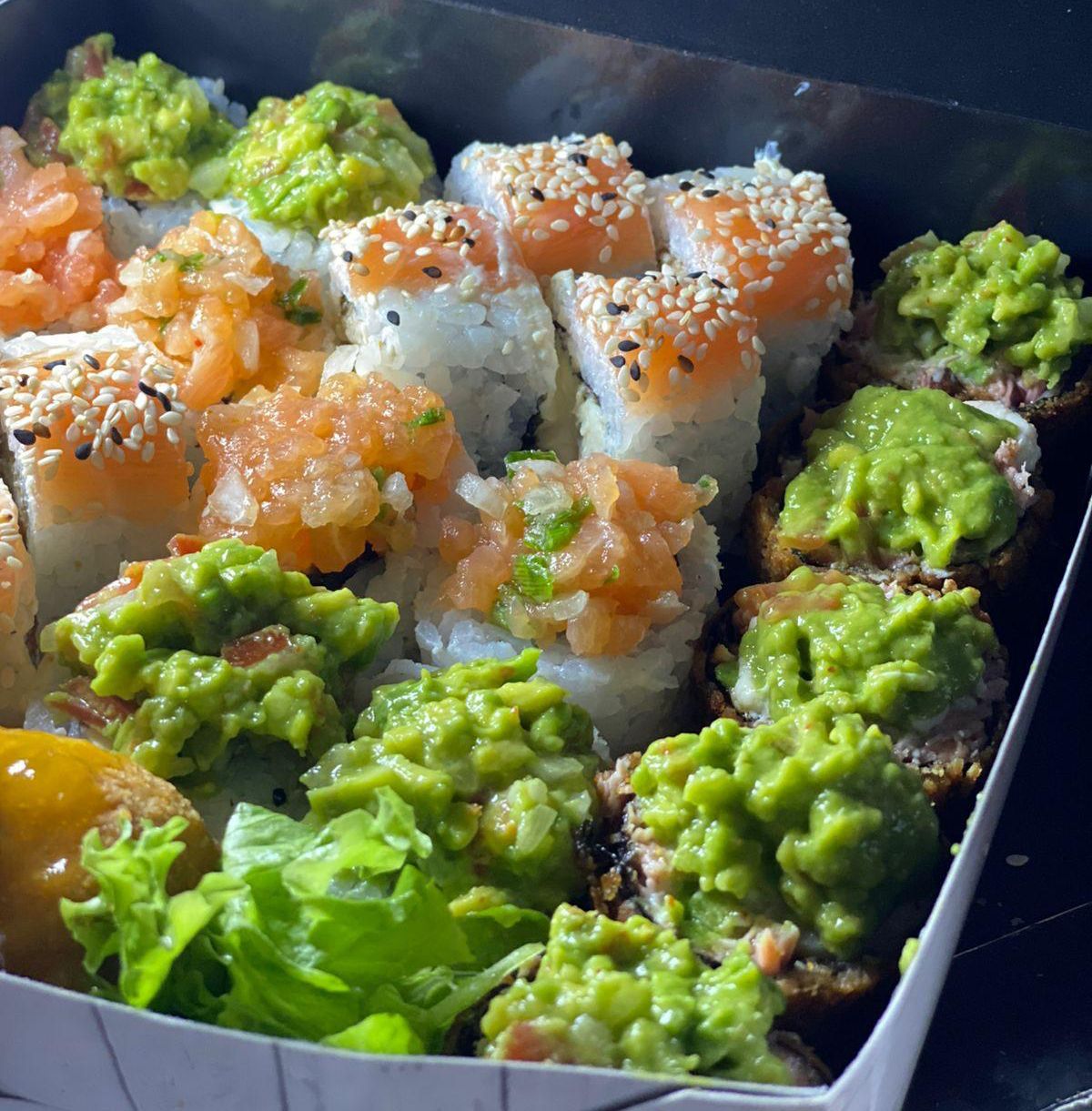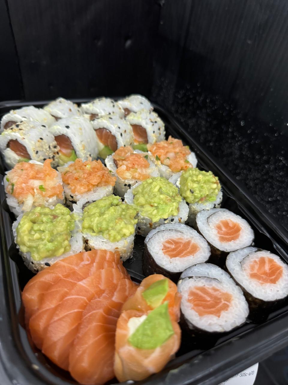 2 tartar – 2 guacamole – 4 philadelphia – 4 maki salmón – 8 salmón hot- 10 calentitos – 5 niguiris hot