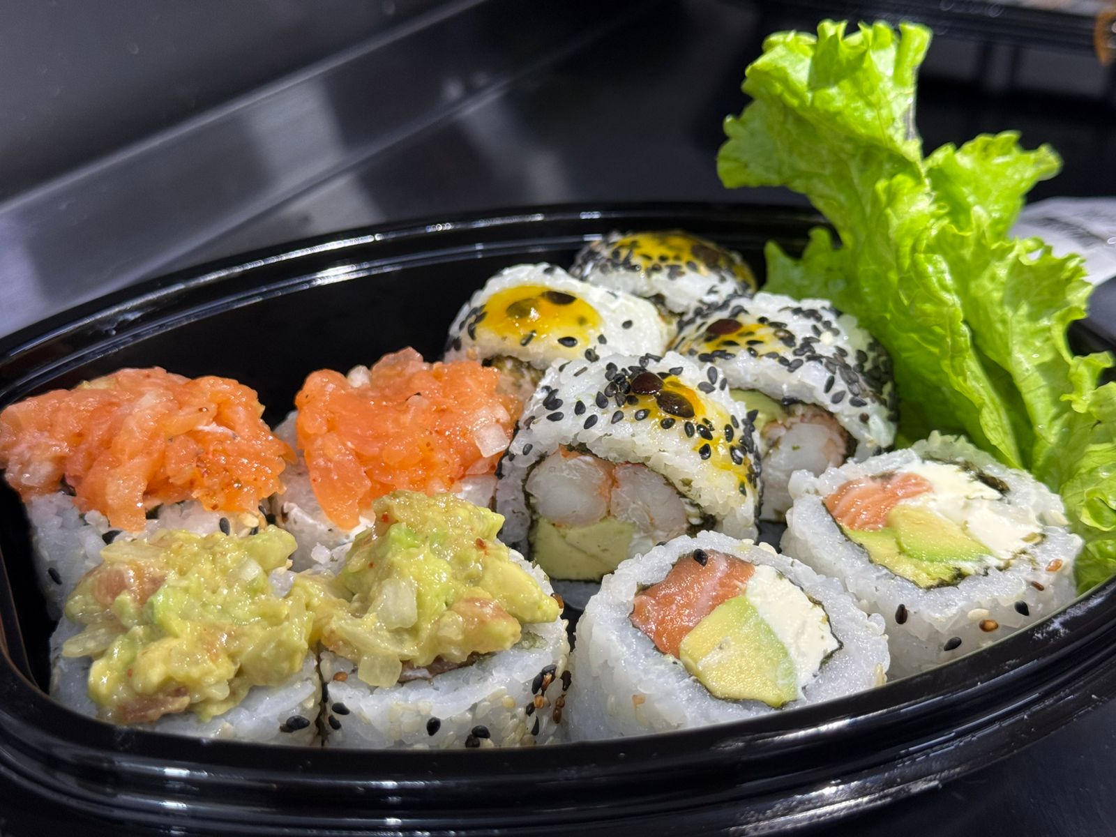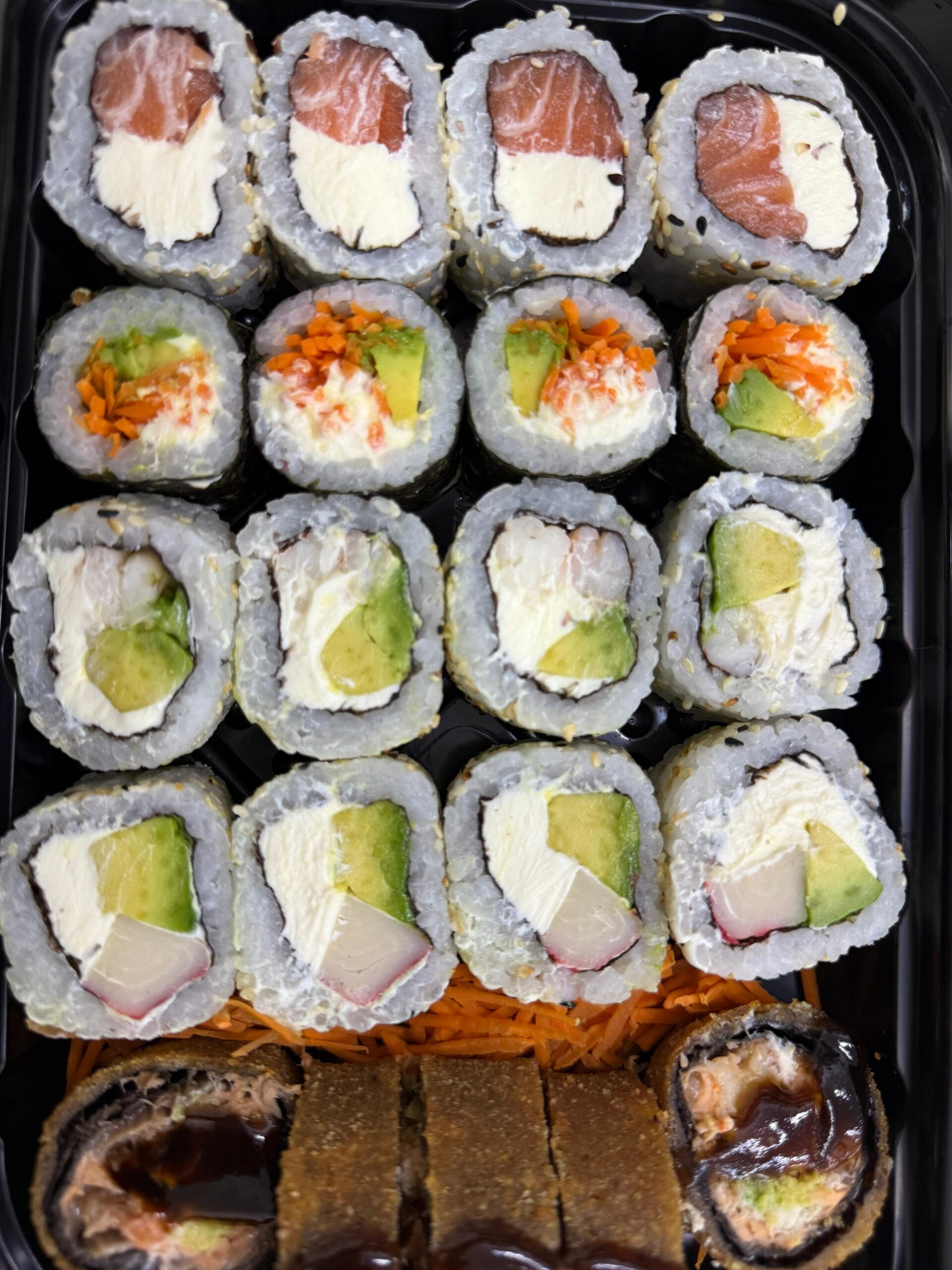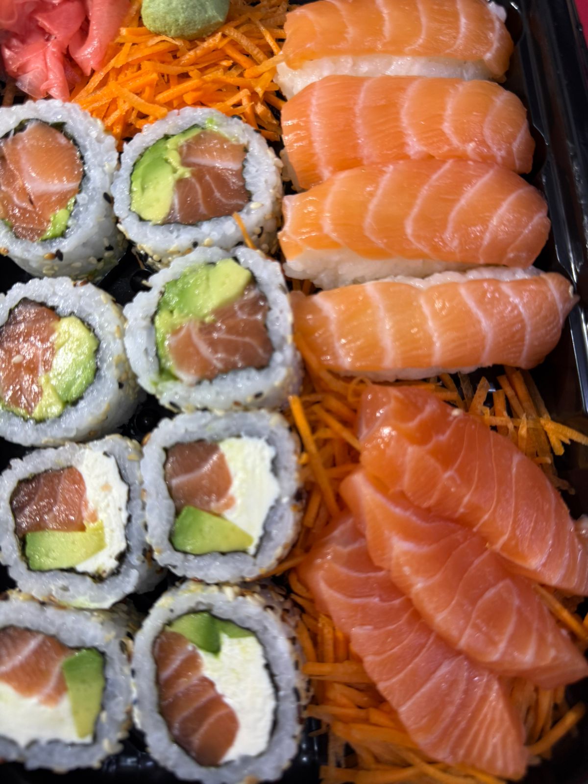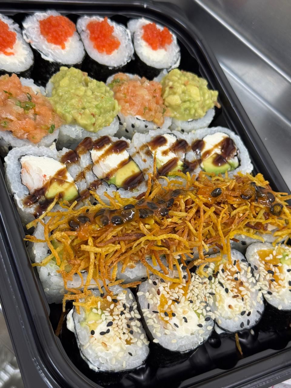 2 tartar – 2 guacamole – 4 philadelphia – 4 maki salmón – 8 salmón hot- 10 calentitos – 5 niguiris hot