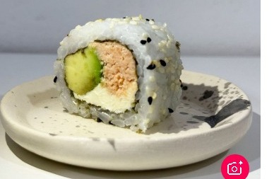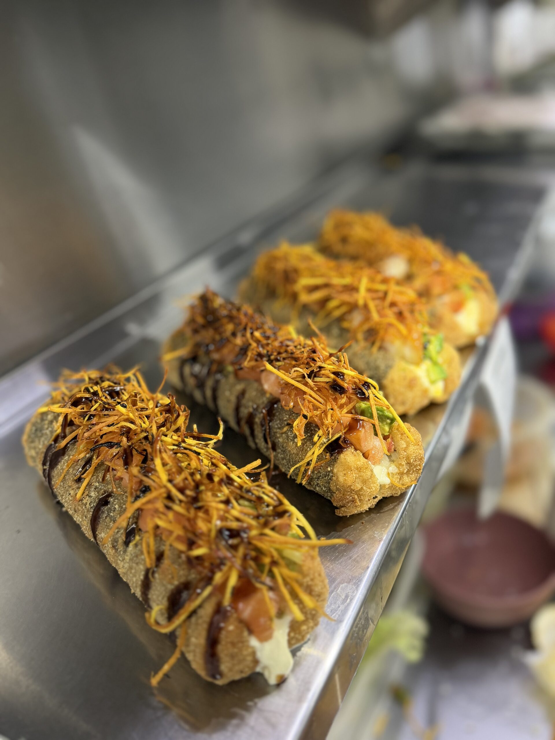 1 UNIDAD : ARROZ Y ALGA REBOZADO, QUESO, SALMON CRUDO (OPCION SALMON COCIDO), GUACAMOLE, BATATAS Y SALSA TERIYAKI